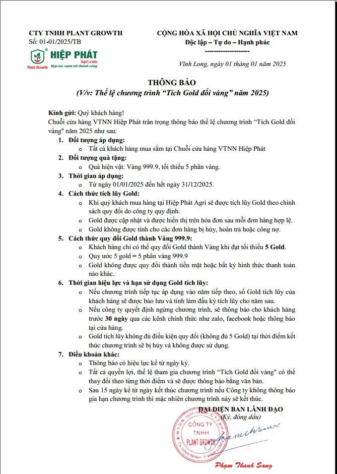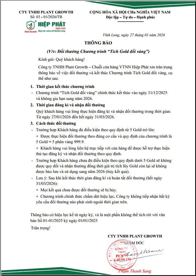 Chuỗi cửa hàng VTNN Hiệp Phát Agri xin trân trọng thông báo đến Quý khách hàng về việc ”Đổi Thưởng” và kết thúc Chương trình “Tích Gold đổi vàng”, cụ thể như sau: